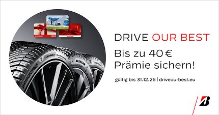 Mit der Bridgestone „DRIVE OUR BEST“ Prämienaktion belohnen wir Ihren Reifenkauf: Sichern Sie sich attraktive Wunschgutscheine im Wert von bis zu 40 €, wenn Sie mindestens 2 Bridgestone Reifen kaufen und sich anschließend online registrieren.